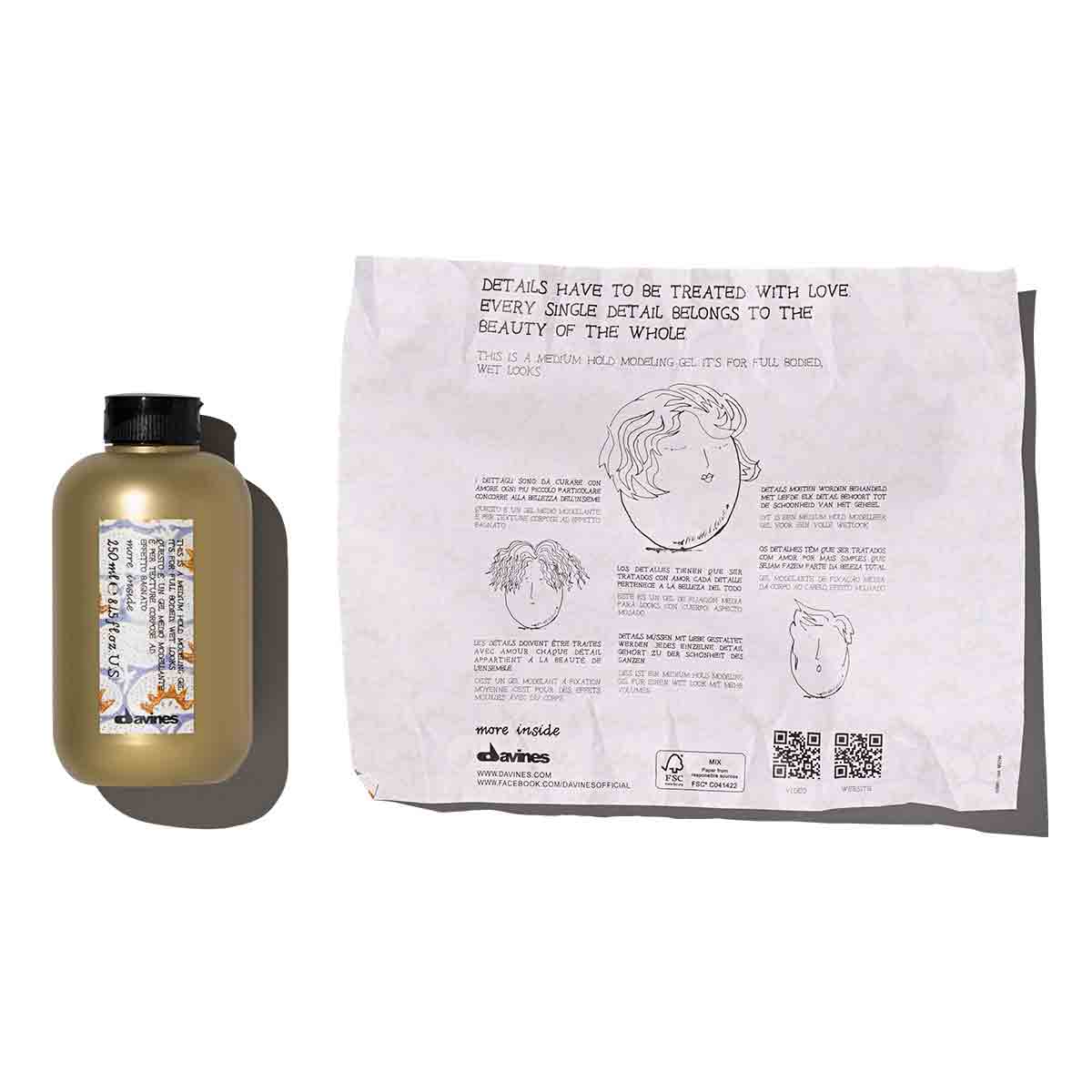 Смолы последнего поколения, входящие в состав продукта, не оставляют следов на волосах и обладают эффектом антифриз. Гель можно использовать не только на прямых, но и на волнистых или кудрявых волосах, чтобы придать локонам объем и эластичность, а также создать эффект мокрых волос.