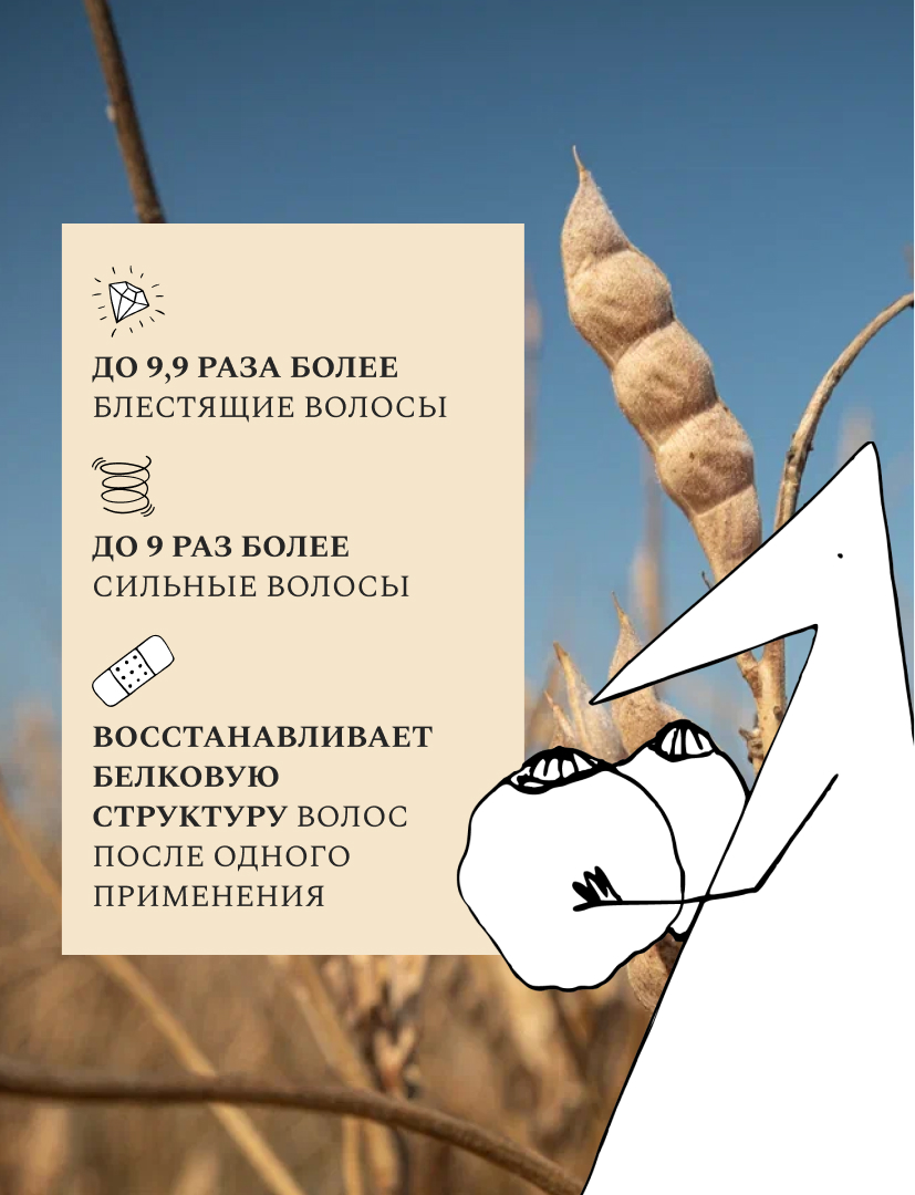 Экстракт люпина, природно богатый белками и клетчаткой, которые укрепляют волосы и придают им силу от корней до кончиков.