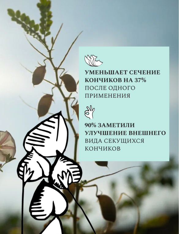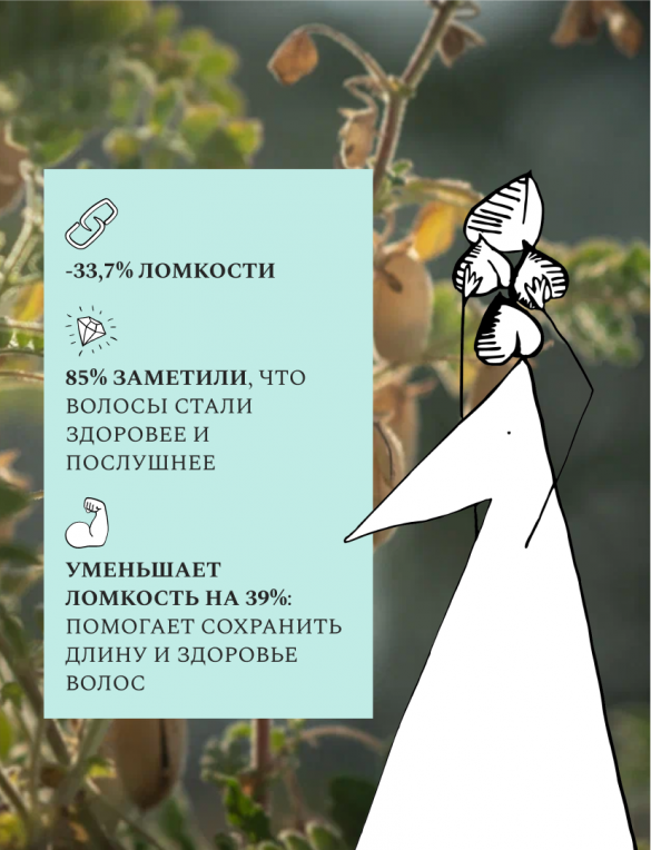 Способствует укреплению волос: полисахариды создают защитную пленку, которая помогает предотвратить ломкость волос, а антиоксиданты сохраняют прочность и структуру волос.